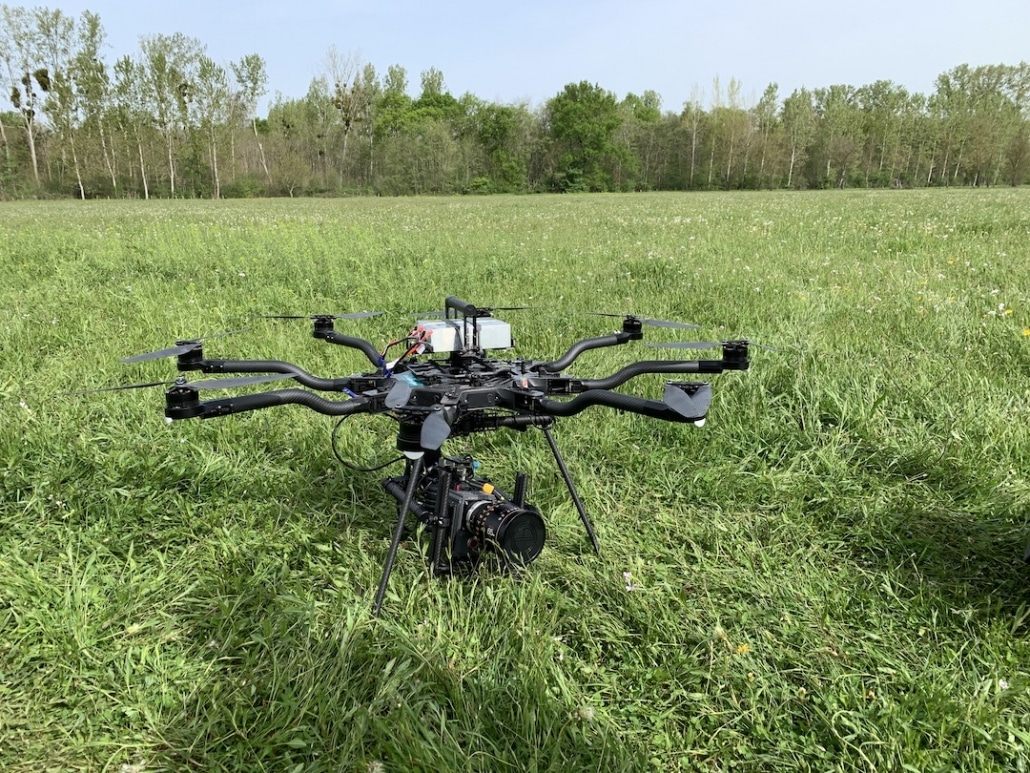 - Nacelle : Modèle Freefly mōvi Pro adaptée pour être emporté sous un drone, avec l’intégration d’un train d’atterrissage. Rotation à 360 degrés sans aucun câblages entre la nacelle et l’aéronef.
